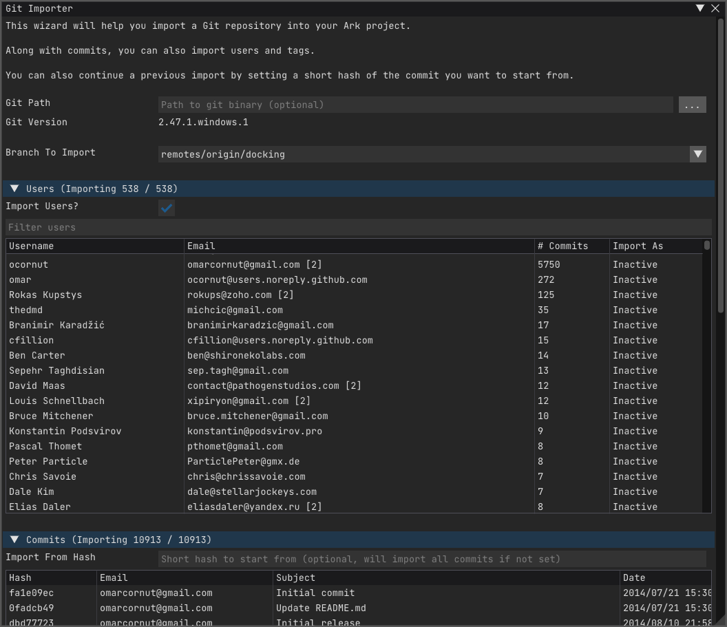 Since version 0.12 Ark has a GUI importer, which is far superior than the cli version was. It allows you to import users, commits and tags, and in a way that is far more intuitive than the cli command was.