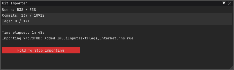 Besides presenting clearer information on the progress, it also allows you to stop the import process in the middle. Just remember to copy the short hash you stopped on in order to continue the next time.