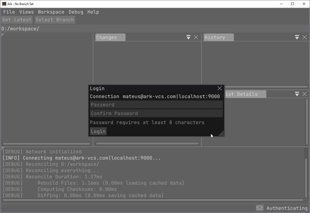 After creating a workspace, you'll now have a new layout with some panels. Ark will automatically try to login to the server, and since it is the first time you'll be asked to set a password.