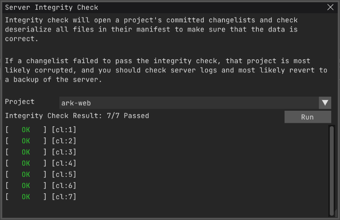 This panel allows any Admin user to trigger from the client an integrity check that will uncompress and checksum the data from all the committed changelists to verify that what we're expecting to have there is what we're actually able to load from the disk.