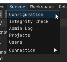 When connected to a server, you have access to a Server Configuration panel, which you can access via Server->Configuration menu: