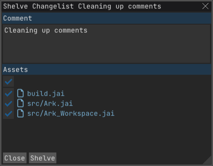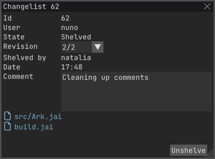 However, Ark takes shelves to a new level. In Perforce, shelves are one way street, meaning that if user A shelves something, user B can only unshelve it, they cannot update or even commit this shelf.