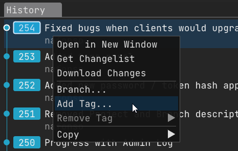 To add a tag to a committed changelist you right-click on it in the History panel and choose Add Tag.
