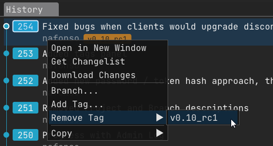 To remove a tag from a committed changelist you right-click on it in the History panel and choose Remove Tag and click on the one you want to remove.